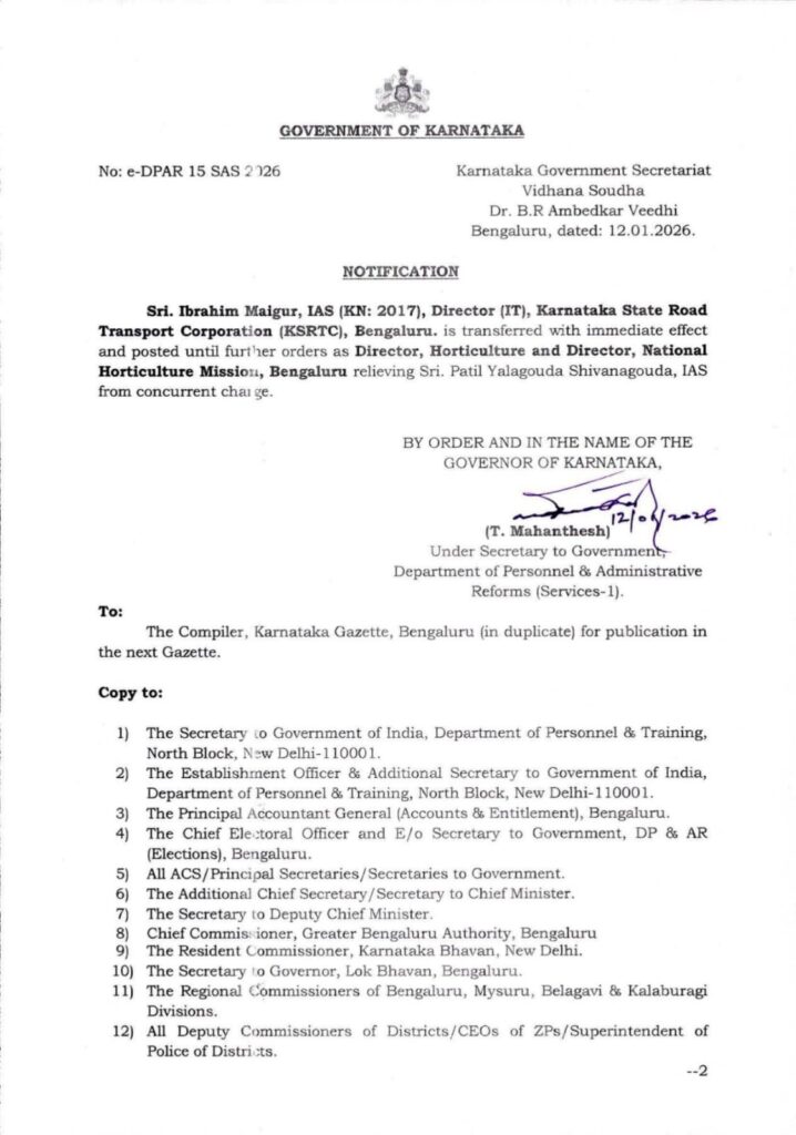 ಜನವರಿ 12 ರಂದು ರಾಜ್ಯ ಸರ್ಕಾರ ಹಿರಿಯ IAS ಅಧಿಕಾರಿ ಇಬ್ರಾಹಿಂ ಮೈಗೂರ್ (2017) ಅವರನ್ನು KSRTC ಯಿಂದ ತೋಟಗಾರಿಕೆ ನಿರ್ದೇಶಕರಾಗಿ ವರ್ಗಾವಣೆಗೊಳಿಸಿ ಆದೇಶ ಹೊರಡಿಸಿದೆ