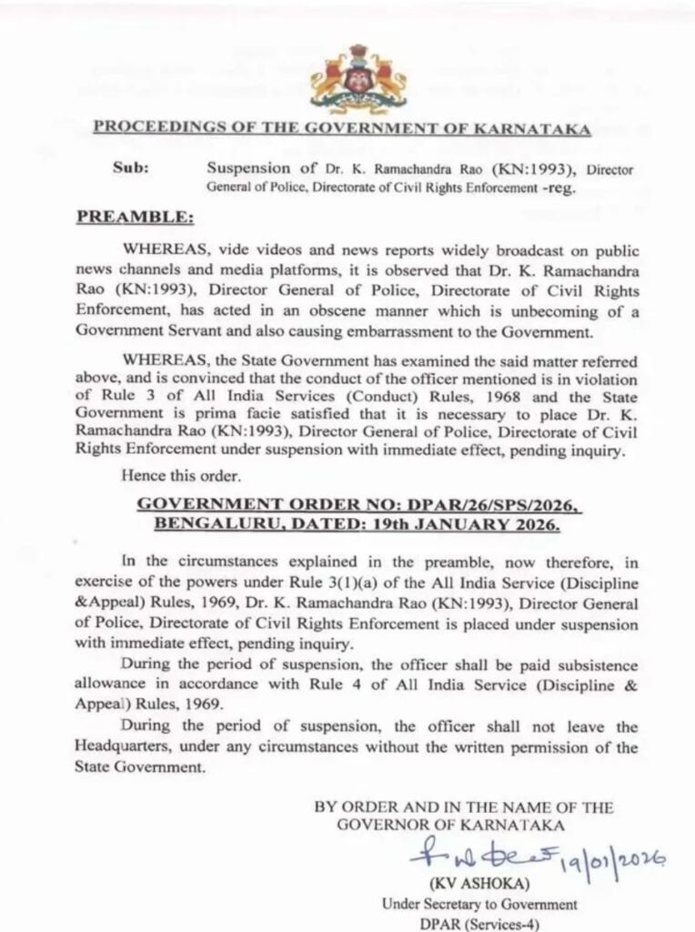 IPS ಆಧಿಕಾರಿ DGP ರಾಮಚಂದ್ರ ರಾವ್ ಕಚೇರಿಗೆ ಬಂದ ಮಹಿಳೆಯರೊಂದಿಗೆ ಖಾಕಿ ಡ್ರಸ್ ನಲ್ಲೇ ಮುದ್ದಾಡುವ ವಿಡಿಯೋ ವೈರಲ್ ಆಗ ಬೆನ್ನಲ್ಲೇ ರಾಜ್ಯದಾದ್ಯಂತ ಕನ್ನಡಿಗರು ಆಕ್ರೋಶ ವ್ಯಕ್ತಪಡಿಸಿದ್ದರು ಗೃಹ ಸಚಿವ ಪರಮೇಶ್ವರ ಆಪ್ತರು ಕ್ರಮ ಸಾಧ್ಯವಿಲ್ಲ ಎಂದೆ ಬಿಸಿ ಬಿಸಿ ಗುಡುತ್ತಿದ್ದರು