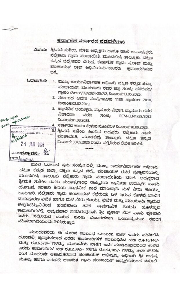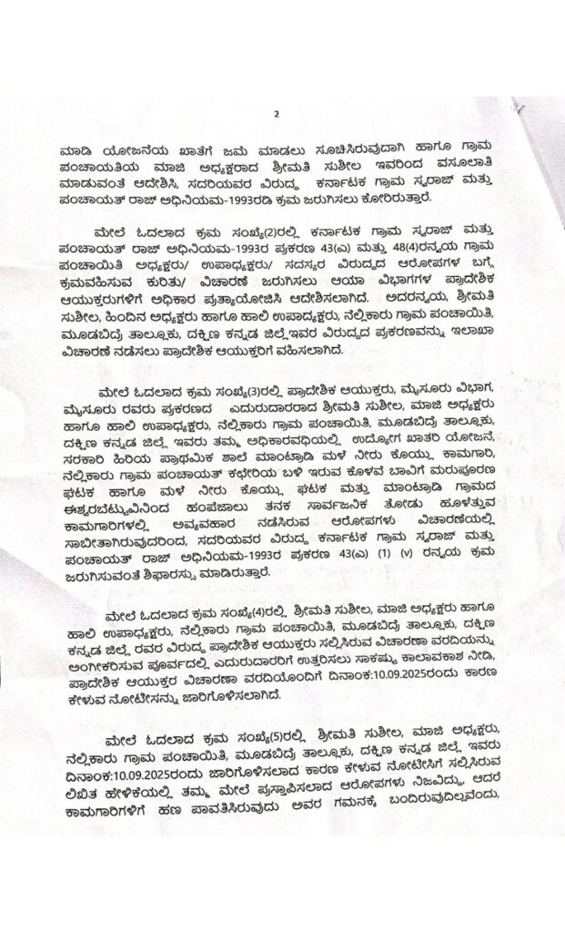 ಮುಂದುವರಿದು ಈ ಸಂಬಂಧ ನೆಲ್ಲಿಕಾರು ಪoಚಾಯಿತಿ ಉಪಾಧ್ಯಕ್ಷ ಸುಶೀಲ ಅವರಿಗೆ ನೋಟಿಸ್ ನೀಡಿದ ಮೇರೆಗೆ ಶ್ರೀಮತಿ ಸುಶೀಲ ರವರು ದಿನಾಂಕ:30.09.2025 ರಂದು ನೀಡಿರುವ ಲಿಖಿತ ಸಮಜಾಯಿಷಿಯನ್ನು ಹಾಗೂ ಕಡತದಲ್ಲಿನ ದಾಖಲೆಗಳನ್ನು ಕೂಲಂಕಷವಾಗಿ ಪರಿಶೀಲಿಸಲಾಗಿದೆ. ಪಂಚಾಯಿತಿಯ ಕಾಮಗಾರಿಗಳು ಪೂರ್ಣಗೊಂಡ ನಂತರ ಹಣ ಪಾವತಿ ಮಾಡುವುದು ಅಧ್ಯಕ್ಷರು ಹಾಗೂ ಪಂಚಾಯಿತಿ ಅಭಿವೃದ್ಧಿ ಅಧಿಕಾರಿಗಳ ಜಂಟಿ ಜವಾಬ್ದಾರಿಯಾಗಿರುತ್ತದೆ.