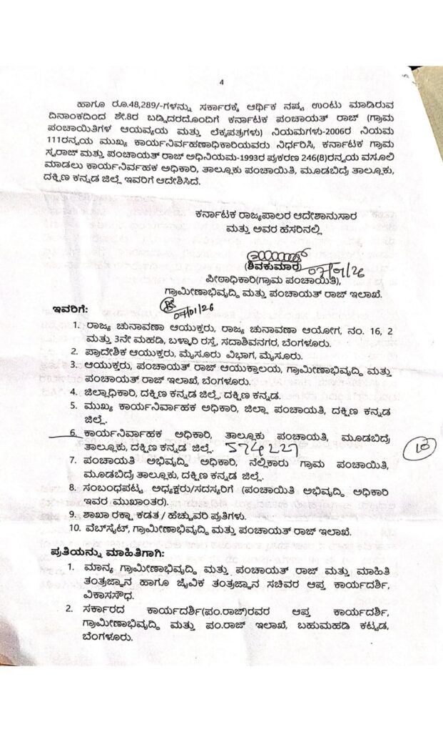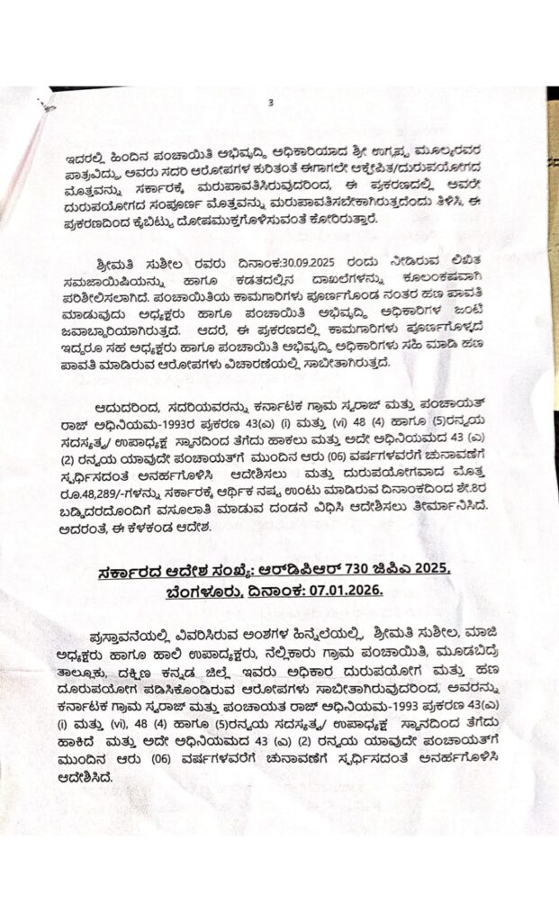 ಪ್ರಸ್ತಾವನೆಯಲ್ಲಿ ವಿವರಿಸಿರುವ ಅಂಶಗಳ ಹಿನ್ನೆಲೆಯಲ್ಲಿ ಶ್ರೀಮತಿ ಸುಶೀಲ, ಮಾಜಿ ಅಧ್ಯಕ್ಷರು ಹಾಗೂ ಹಾಲಿ ಉಪಾದ್ಯಕ್ಷರು, ನೆಲ್ಲಿಕಾರು ಗ್ರಾಮ ಪಂಚಾಯಿತಿ, ಮೂಡಬಿದ್ರೆ ತಾಲ್ಲೂಕು, ದಕ್ಷಿಣ ಕನ್ನಡ ಜಿಲ್ಲೆ ಇವರು ಅಧಿಕಾರ ದುರುಪಯೋಗ ಮತ್ತು ಹಣ ದೂರುಪಯೋಗ ಪಡಿಸಿಕೊಂಡಿರುವ ಆರೋಪಗಳು ಸಾಬೀತಾಗಿರುವುದರಿಂದ, ಅವರನ್ನು ಕರ್ನಾಟಕ ಗ್ರಾಮ ಸ್ವರಾಜ್ ಮತ್ತು ಪಂಚಾಯತ ರಾಜ್ ಅಧಿನಿಯಮ-1993 ಪ್ರಕರಣ 43(ಎ) (i) ಮತ್ತು (vi), 48 (4) ಹಾಗೂ (5)ರನ್ವಯ ಸದಸ್ಯತ್ವ/ ಉಪಾಧ್ಯಕ್ಷ ಸ್ಥಾನದಿಂದ ತೆಗೆದು ಹಾಕಿದೆ ಮತ್ತು ಅದೇ ಅಧಿನಿಯಮದ 43 (ಎ) (2) ರನ್ವಯ ಯಾವುದೇ ಪಂಚಾಯತ್ಗೆ ಮುಂದಿನ ಆರು (06) ವರ್ಷಗಳವರೆಗೆ ಚುನಾವಣೆಗೆ ಸ್ಪರ್ಧಿಸದಂತೆ ಅನರ್ಹಗೊಳಿಸಿ ಆದೇಶಿಸಿದೆ. ಹಾಗೂ ರೂ.48,289/-ಗಳನ್ನು ಸರ್ಕಾರಕ್ಕೆ ಆರ್ಥಿಕ ನಷ್ಟ ಉಂಟು ಮಾಡಿರುವ ದಿನಾಂಕದಿಂದ ಶೇ.8ರ ಬಡ್ಡಿದರದೊಂದಿಗೆ ಕರ್ನಾಟಕ ಪಂಚಾಯತ್ ರಾಜ್ (ಗ್ರಾಮ ಪಂಚಾಯಿತಿಗಳ ಆಯವ್ಯಯ ಮತ್ತು ಲೆಕ್ಕಪತ್ರಗಳು) ನಿಯಮಗಳು-2006ರ ನಿಯಮ 111ರನ್ವಯ ಮುಖ್ಯ ಕಾರ್ಯನಿರ್ವಹಣಾಧಿಕಾರಿಯವರು ನಿರ್ಧರಿಸಿ, ಕರ್ನಾಟಕ ಗ್ರಾಮ ಸ್ವರಾಜ್ ಮತ್ತು ಪಂಚಾಯತ್ ರಾಜ್ ಅಧಿನಿಯಮ-1993ರ ಪ್ರಕರಣ 246(8)ರನ್ವಯ ವಸೂಲಿ ಮಾಡಲು ಕಾರ್ಯನಿರ್ವಹಕ ಅಧಿಕಾರಿ, ತಾಲ್ಲೂಕು ಪಂಚಾಯಿತಿ, ಮೂಡಬಿದ್ರೆ ತಾಲ್ಲೂಕು, ದಕ್ಷಿಣ ಕನ್ನಡ ಜಿಲ್ಲೆ ಇವರಿಗೆ ಕರ್ನಾಟಕ ರಾಜ್ಯಪಾಲ ಇವರ ಆದೇಶ ಅನುಸಾರ ಮತ್ತು ಅವರ ಹೆಸರಿನಲ್ಲಿ ಪೀಠಾಧಿಕಾರಿಯಾಗಿರುವ ಶ್ರೀ ಶಿವಕುಮಾರ್ ಅವರು ಆದೇಶಿಸಿರುತ್ತಾರೆ