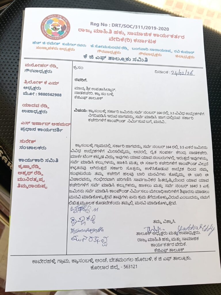 ಕೆಜಿಎಫ್ ತಾಲೂಕಿನ ಕ್ಯಾಸಂಬಳ್ಳಿ ಹೋಬಳಿ ನಾಡಕಚೇರಿ ಮತ್ತು ಇತರೆ ಕಚೇರಿಗಳಿರುವ ಸರ್ಕಾರಿ ಭೂಮಿಗೆ ಒತ್ತುವರಿಯಾಗಿದೆ ಅದನ್ನು ರಕ್ಷಣೆ ಮಾಡುವಂತೆ ಒತ್ತಾಯಿಸಿ ರಾಜ್ಯ ಮಾಹಿತಿ ಹಕ್ಕು ಮತ್ತು ಸಾಮಾಜಿಕ ಕಾರ್ಯಕರ್ತರ ವೇದಿಕೆಯ ತಾಲ್ಲೂಕು ಅಧ್ಯಕ್ಷರಾದ ತ್ರಿಲೋಕ್ ಅವರ ನೇತೃತ್ವದಲ್ಲಿ ಕ್ಯಾಸಂಬಳ್ಳಿ ನಾಡಕಚೇರಿಯ ಉಪ ತಹಶೀಲ್ದಾರ್ ಅವರಿಗೆ ಮನವಿ ಸಲ್ಲಿಸಿದರು