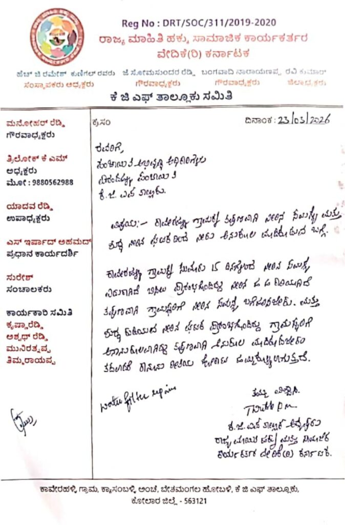 . ಈ ವೇಳೆ ರಾಜ್ಯ ಮಾಹಿತಿ ಹಕ್ಕು ಮತ್ತು ಸಾಮಾಜಿಕ ಕಾರ್ಯಕರ್ತರ ವೇದಿಕೆಯ ಕೆಜಿಎಫ್ ತಾಲ್ಲೂಕು ಅಧ್ಯಕ್ಷರಾದ ತ್ರಿಲೋಕ್ ರವರು, ಜಿಲ್ಲಾ ಗೌರವ ಅಧ್ಯಕ್ಷರು ಆದ ಜೆ.ಸೋಮಸುಂದರ ರೆಡ್ಡಿ ರವರು ಹಾಗೂ ಇನ್ನಿತರೆ ಕಾರ್ಯಕರ್ತರು ಹಾಜರಿದ್ದರು…